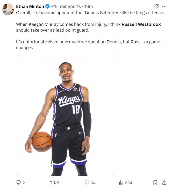 美记Ethan Minton:总的来说,施罗德对国王的进攻造成巨大影响他是一个拖累。当基根穆雷复出后,我认为威少应该成为球队的先发控球后卫,尽管国王在施罗德身上花了很多钱,但很明显威少才是一个可以改变比赛的球员。
