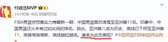 中国男篮暴跌至亚洲第11名,付政浩发声:呼吁中国男篮尽快换帅