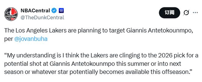 北京时间12月18日,据湖人队记布哈透露,湖人队一直牢牢攥着2026年的首轮选秀权,意在今年夏天或下个赛季抓住机会引进字母哥。